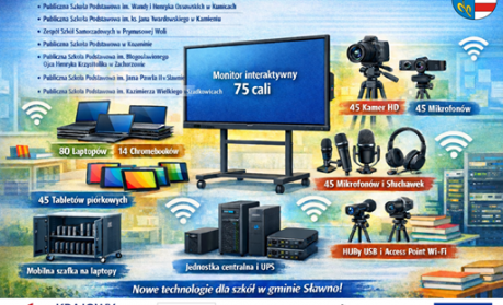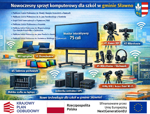 Szkoły podstawowe z terenu gminy Sławno zostaną wyposażone w nowoczesny sprzęt komputerowy oraz rozwiązania informatyczne, które znacząco podniosą jakość kształcenia i umożliwią jeszcze szersze wykorzystanie technologii cyfrowych w edukacji. W ramach przedsięwzięcia wsparcie otrzymało siedem placówek oświatowych: