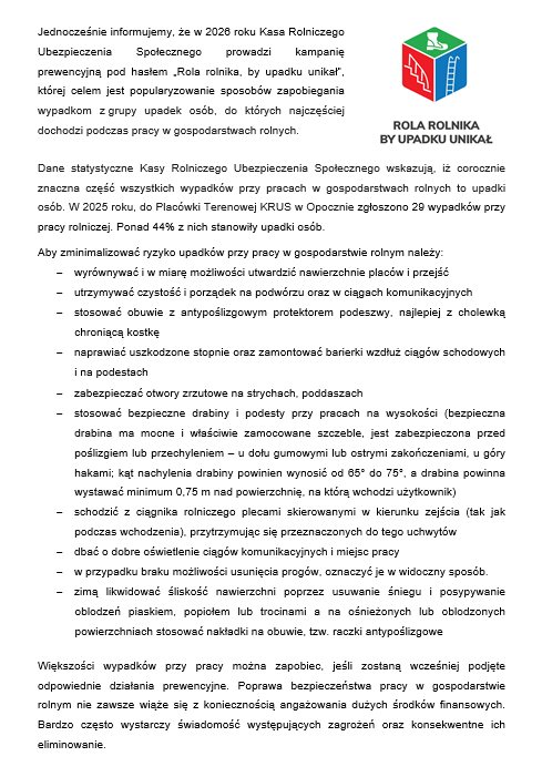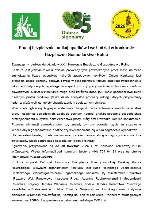 Prezes Kasy Rolniczego Ubezpieczenia Społecznego Tomasz Ślusarczyk zaprasza właścicieli gospodarstw rolnych do udziału w XXIII Ogólnokrajowym Konkursie „Bezpieczne Gospodarstwo Rolne”. KOWR jest jednym z partnerów i współorganizatorów konkursu.